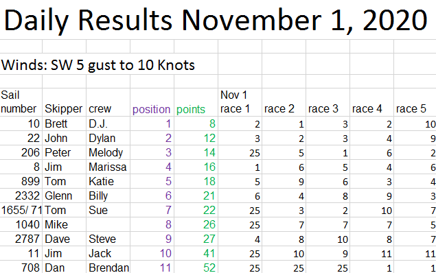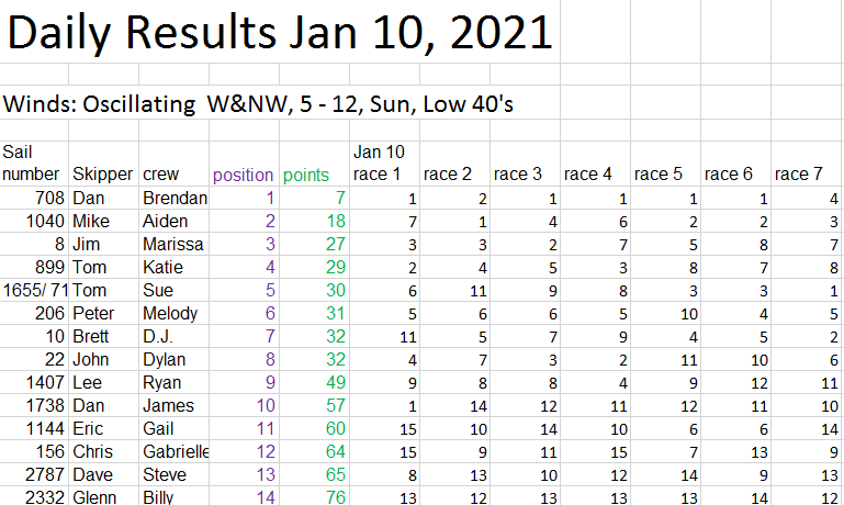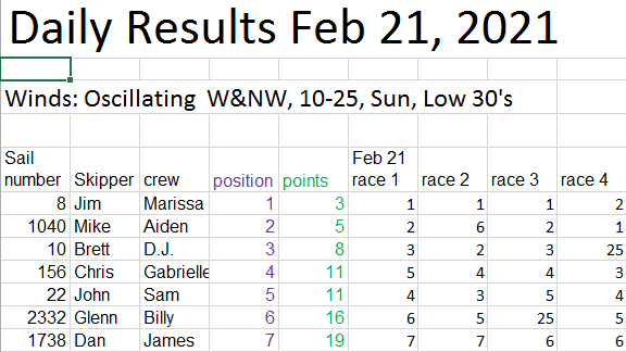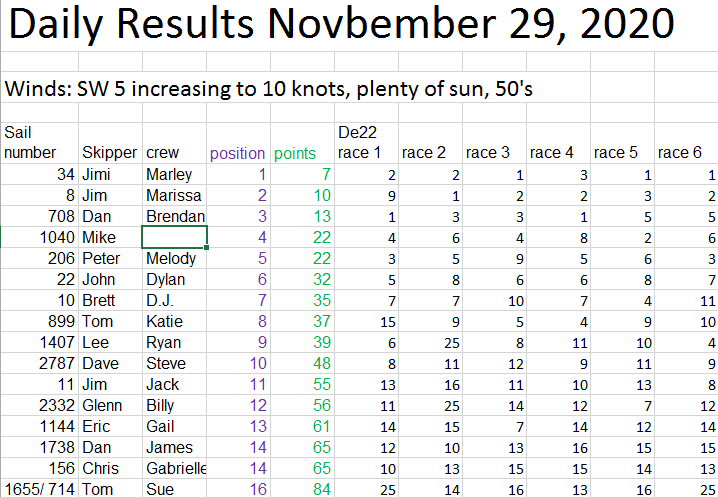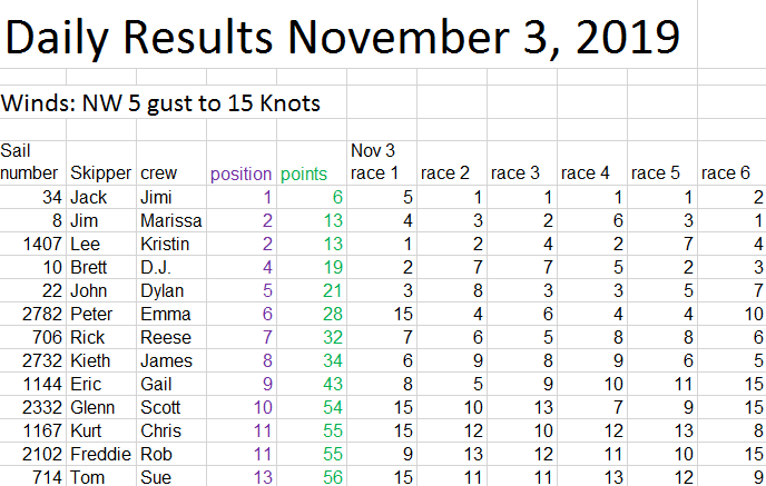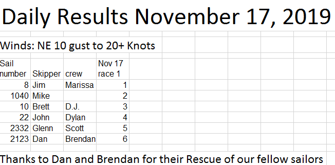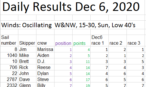 December 15, 2019 Racing Cancelled. Winds W at 15 to 30 knots